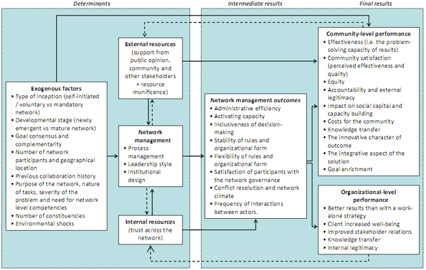 El model teòric següent fou desenvolupat per a l'anàlisi empírica (Kenis i Provan, 2009; Klijn et al. 2010; Cepiku, 2013), tenint en compte tres tipus d'elements: