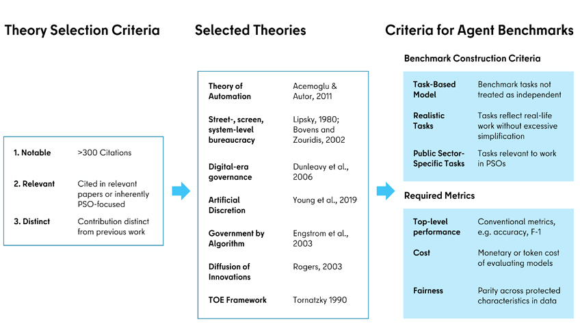 Basat en processos: Moltes teories de l’administració pública comparteixen la descomposició conceptual d’organitzacions, sistemes i llocs de treball en les seves tasques constitutives. Els benchmarks d’agents no haurien de limitar-se a provar aquestes tasques com si fossin independents —com és habitual en els benchmarks de LLM no agentius—, sinó que també haurien de reflectir la seva agregació en superestructures rellevants, especialment en processos. Per exemple, un benchmark sobre la presa de decisions en matèria de prestacions socials hauria de basar-se en un model conceptual de tot el procés, i les tasques avaluades haurien de ser parts d’aquest procés vinculades de manera significativa.