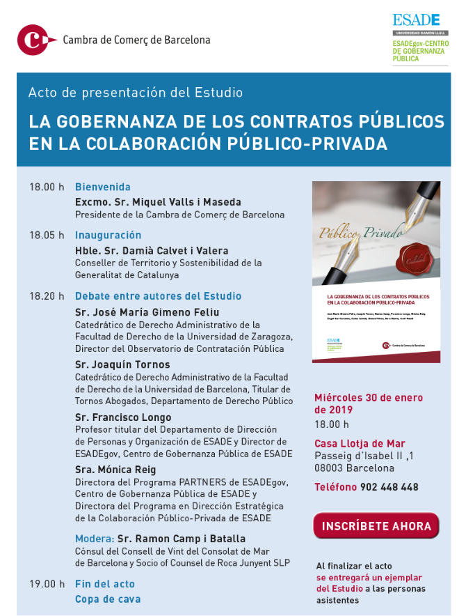 Concretament, l’estudi La gobernanza de los contratos públicos en la colaboración público-privada, elaborat pel Centre de Governança Pública (ESADEgov) d’ESADE i la Cambra de Comerç de Barcelona, destaca que a Espanya es necessita una nova cultura de la governança de la col·laboració publicoprivada (CPP), orientada especialment satisfer l’interès públic i que alhora asseguri una millor eficiència de l’actuació pública i privada. Aquest informe analitza, des d’una perspectiva multidisciplinària, les qüestions relatives a la governança de les CPP a Espanya.