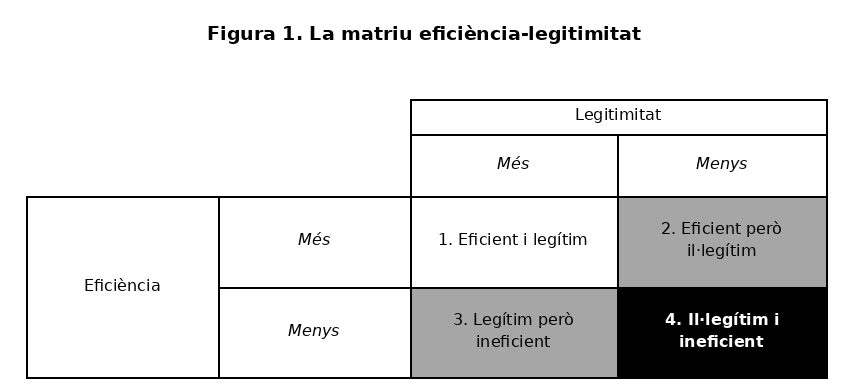 El primer i el quart escenari plantegen pocs riscos per a l’èxit de la reforma. Les reformes que milloren l’assoliment d’objectius i reforcen la legitimitat se situen en un “punt òptim” on el rendiment instrumental i social coincideixen (quadre 1). Les que reduirien tant la legitimitat com l’eficiència (quadre 4) presumiblement es consideren poc. Tanmateix, apareixen dilemes clars en els escenaris segon i tercer (en gris), on eficiència i legitimitat entren en tensió. Els reformadors han d’escollir entre reformes que milloren el rendiment però sacrifiquen suport social, o bé prioritzar la legitimitat assumint un menor rendiment o buscant mecanismes per mitigar-lo, com ara el “desacoblament” entre la part externa i interna de l’organització [11].