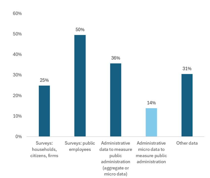 Per respondre aquesta pregunta, hem revisat tots els articles empírics quantitatius publicats entre els anys 2013 i 2023 a dues de les revistes més destacades sobre administració pública: la Public Administration Review i el Journal of Public Administration Research and Theory. A partir de la codificació manual de les fonts de dades mapejades en la funció de l’administració pública (p. ex., enquestes a funcionaris públics, enquestes ciutadanes, dades de contractació, dades d’expedients, dades de la plantilla) i del seu abast (administració pública bàsica, de primera línia o d’altres), hem trobat que el 50% es basen en enquestes a empleats públics i el 25%, en enquestes a ciutadans o a empreses. Per contra, les microdades administratives (el 14% dels articles) estan infraexplotades. La figura 2 mostra la proporció d’articles que es basen en els diferents tipus de dades de govern.