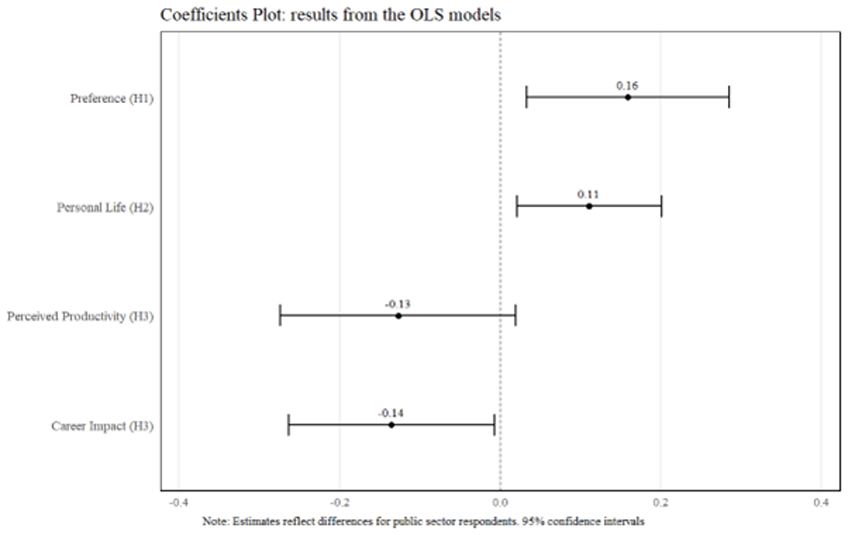 Aquestes diferències no són només preferències abstractes. Reflecteixen contrastos motivacionals i estructurals entre l’ocupació pública i la privada que són temes clau en la literatura sobre gestió pública. Els servidors públics sovint estan més motivats per factors intrínsecs i pro socials com l’equilibri entre vida laboral i personal i el benestar, en lloc de per recompenses extrínseques com el sou i la promoció. Com que el teletreball afavoreix generalment aquests factors, és lògic que els empleats públics l’abracin amb més entusiasme.
